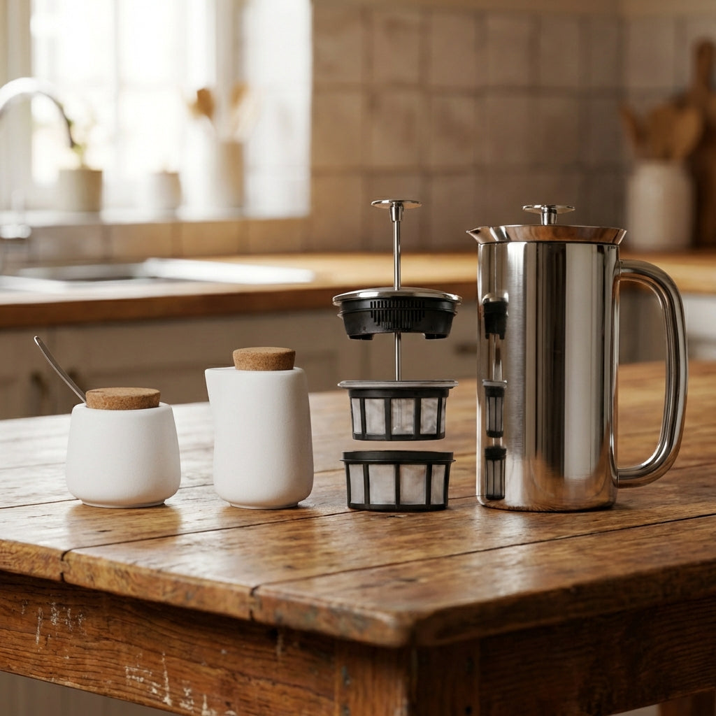 This bundle pairs the engineering excellence of the grit-free ESPRO P7 French Press with the refined simplicity of the VIVA Nicola Milk and Sugar Set. It's the ideal collection for the coffee lover who demands the best flavor and appreciates a beautiful presentation at the breakfast or dinner table.