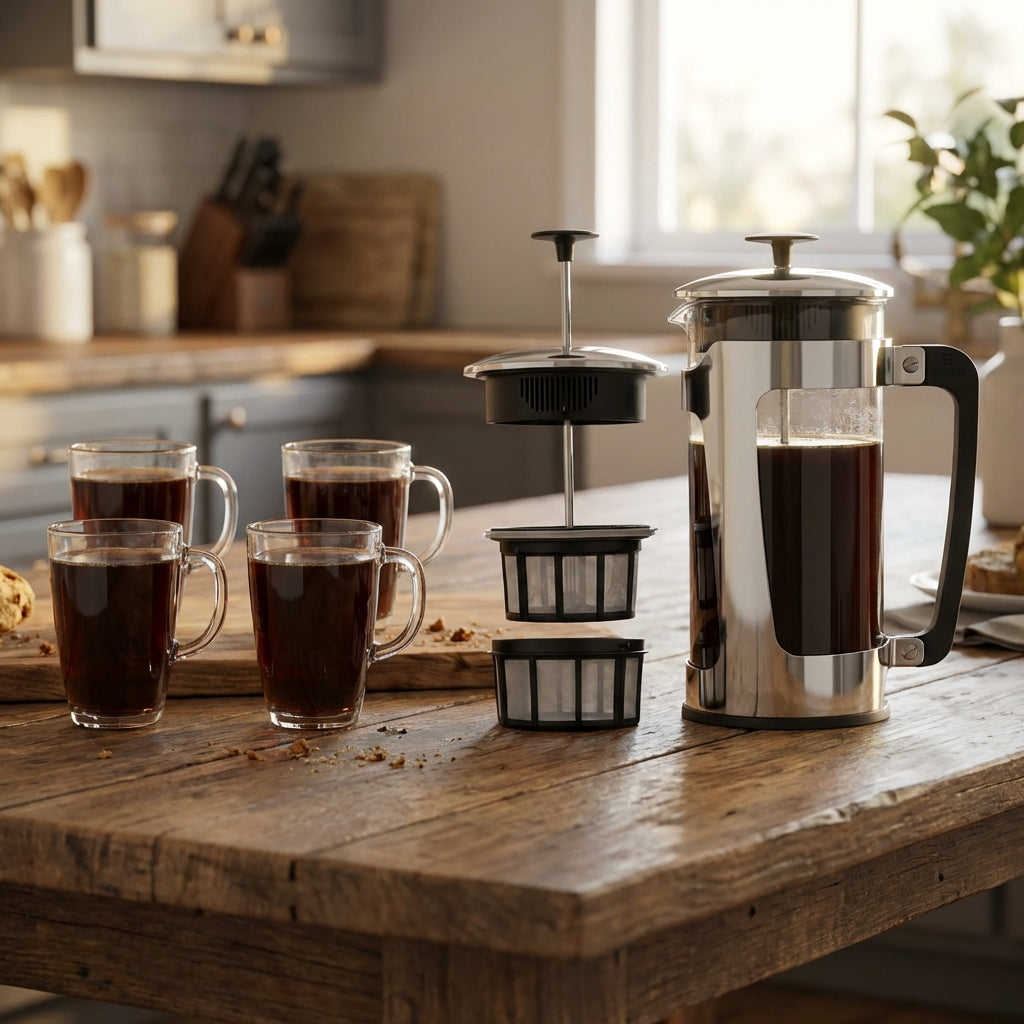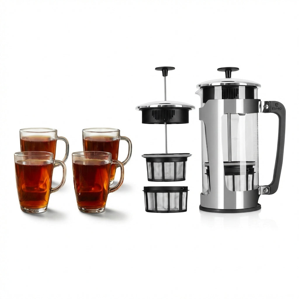 Patented double micro-mesh filters strain coffee grounds through filters that are 9-times and 12-times finer than typical French presses in order to prevent grit from entering your coffee.